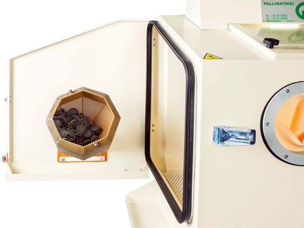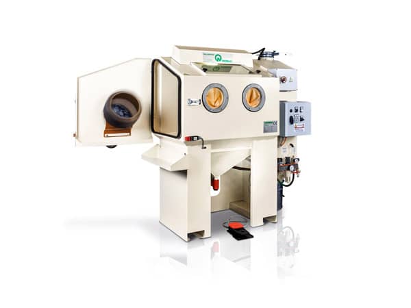 La prima pallinatrice, di piccole dimensioni, ha un campo di lavoro interno di 1000 x 800 mm dove l’operatore può sabbiare pezzi manualmente tramite gli appositi guanti di presa, oppure inserire alcuni pezzi nel cestello rotante interno ed avviare il programma più idoneo.